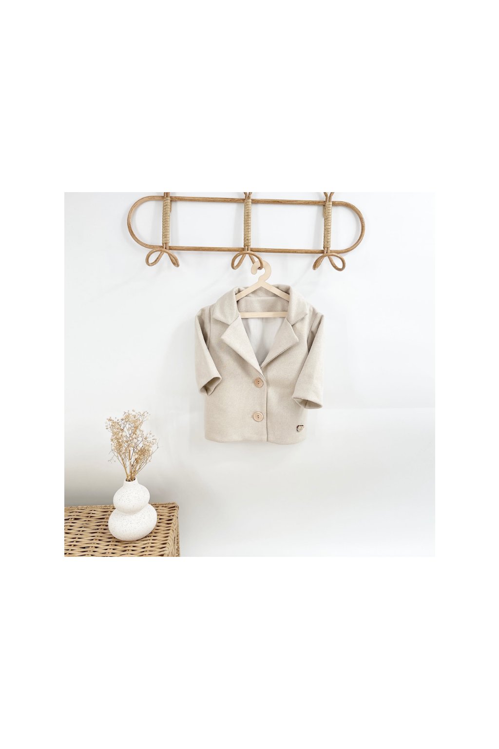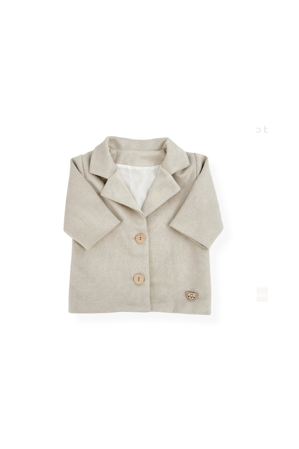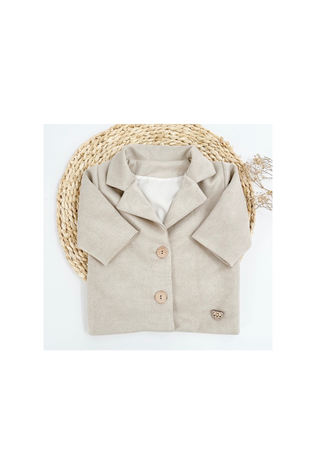 Kabát ideálny na každú príležitosť, vyrobený z mäkkého semišového úpletu v pieskovo béžovej farbe s ľahkou viskózovou podšívkou. Kabát sa zapína na drevené gombíky, je mäkký na dotyk a veľmi prítulný, nesvrbí ani neškriabe.