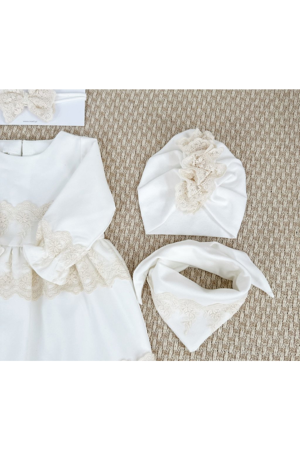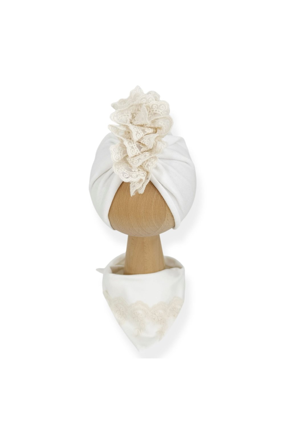 Hrubý zimný turban na krst vyrobený z dvoch vrstiev elastického rebrovaného bavlneného úpletu v ekrovej farbe a šál, celý ozdobený béžovou čipkou Matylda. Vzhľadom na svoju hmotnosť odporúčame túto hrúbku pre zimné teploty pod 10 stupňov.