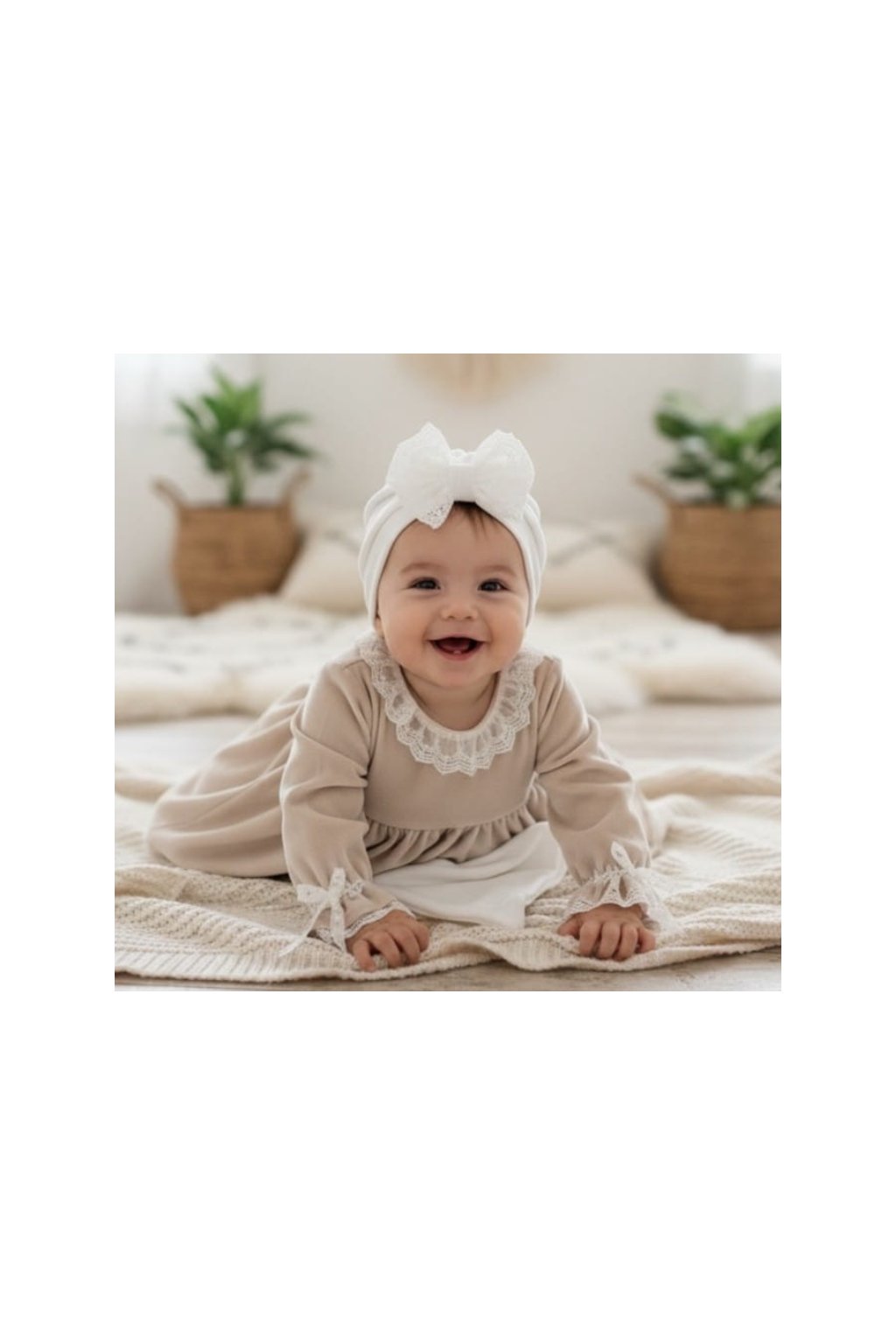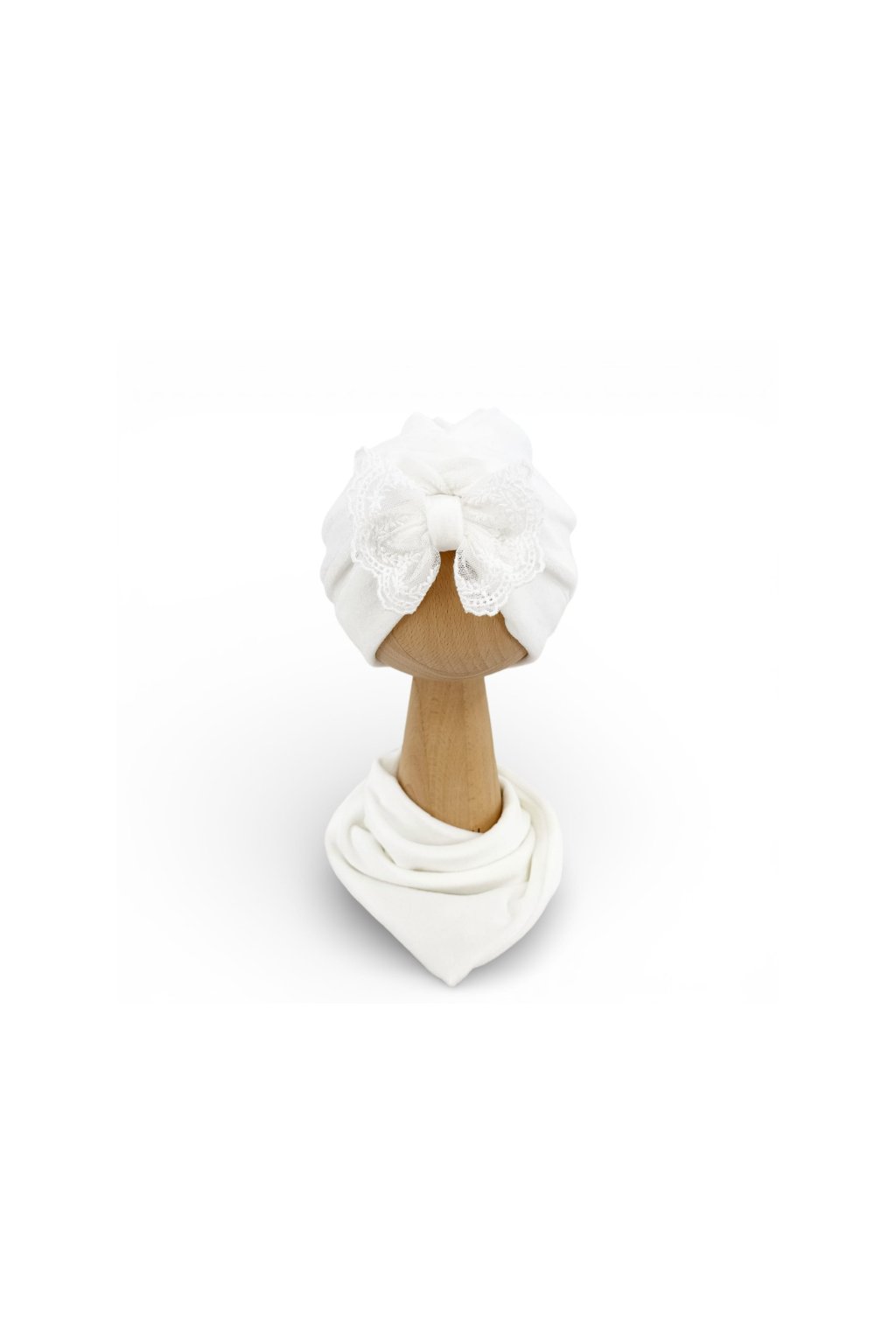 Turban na krst vyrobený z mäkkého, nadýchaného, elastického zamatu s čipkovanou mašľou, od Anastazje a ecru šatkou.