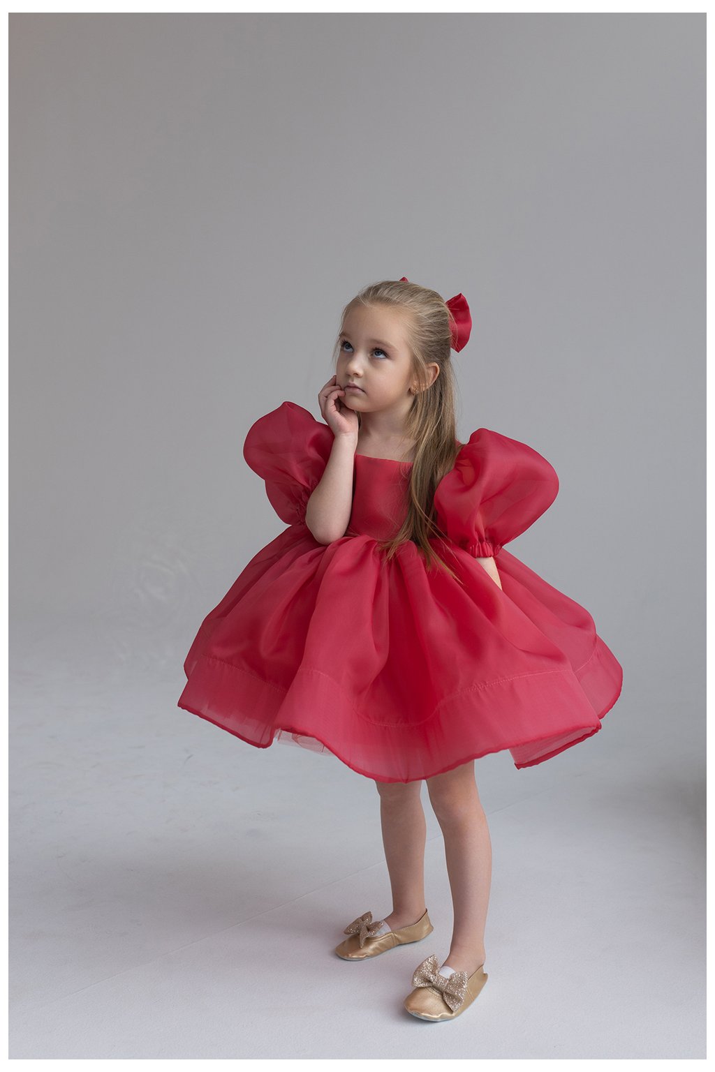 Výrazné dievčenské spoločenské šaty v žiarivej červenej farbe, ktoré očaria na prvý pohľad svojím nadýchaným objemom a romantickým vzhľadom. Ľahký transparentný materiál vytvára bohatú sukňu aj efektné balónové rukávy, vďaka čomu šaty pôsobia slávnostne, jemne a zároveň hravo. Dominantným detailom je veľká mašľa na zadnej strane, ktorá dodáva modelu jedinečný a elegantný charakter. Ideálna voľba na oslavy, svadby, fotenie či výnimočné príležitosti.