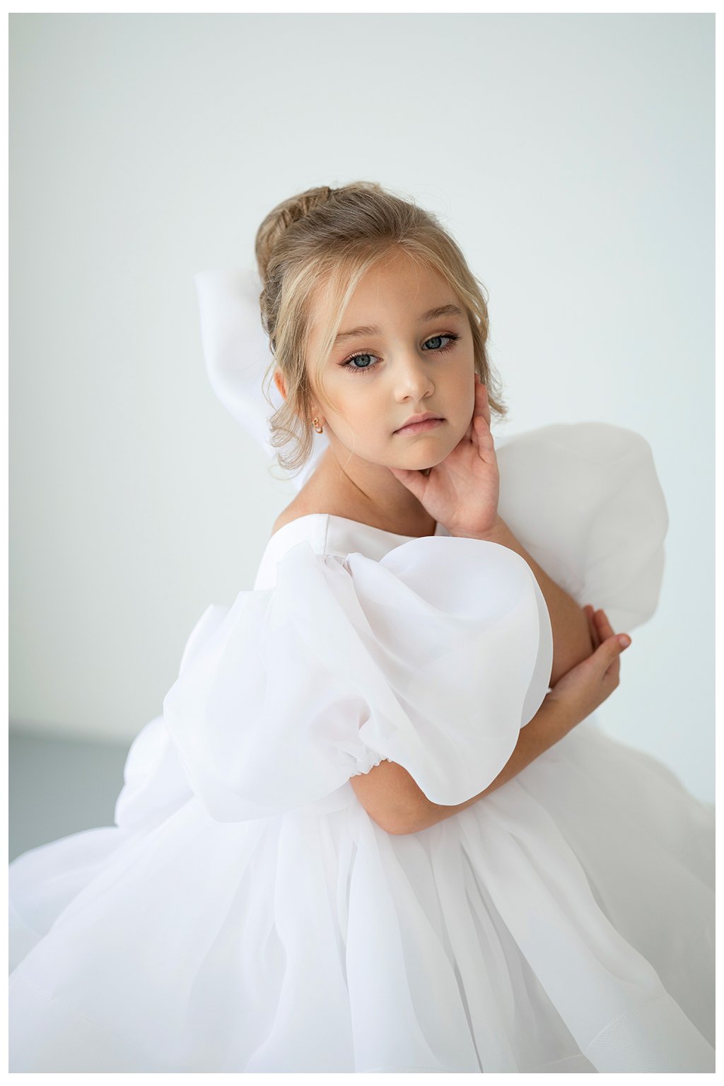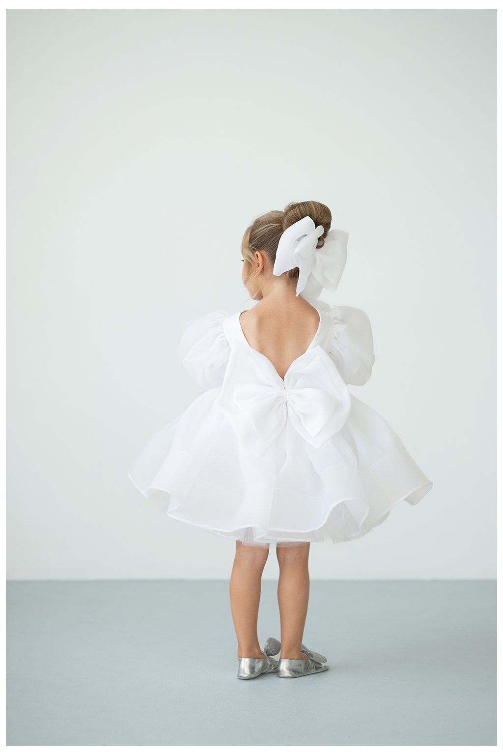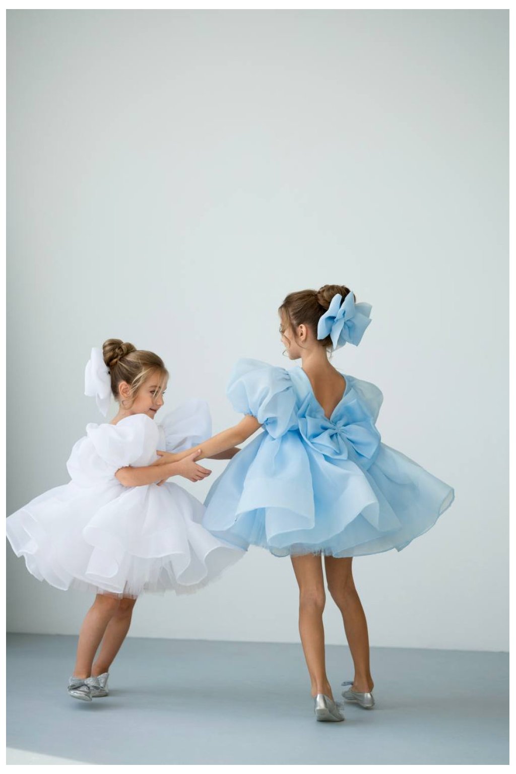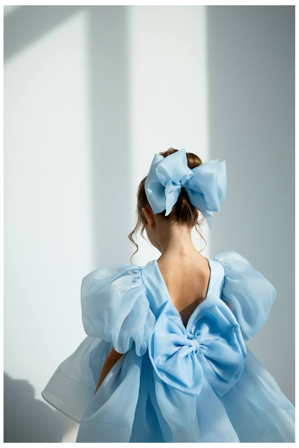 Bohatá, nadýchaná sukňa vytvára nádherný objem pri každom kroku či otočke a dodáva šatám výnimočný slávnostný vzhľad. Jemné rukávy a výrazná veľká mašľa na chrbte sú detailom, ktorý upúta na prvý pohľad. Súčasťou šiat je aj veľká ladiaca mašľa do vlasov, ktorá dokonale doplní celý outfit a vytvorí čarovný, harmonický vzhľad.