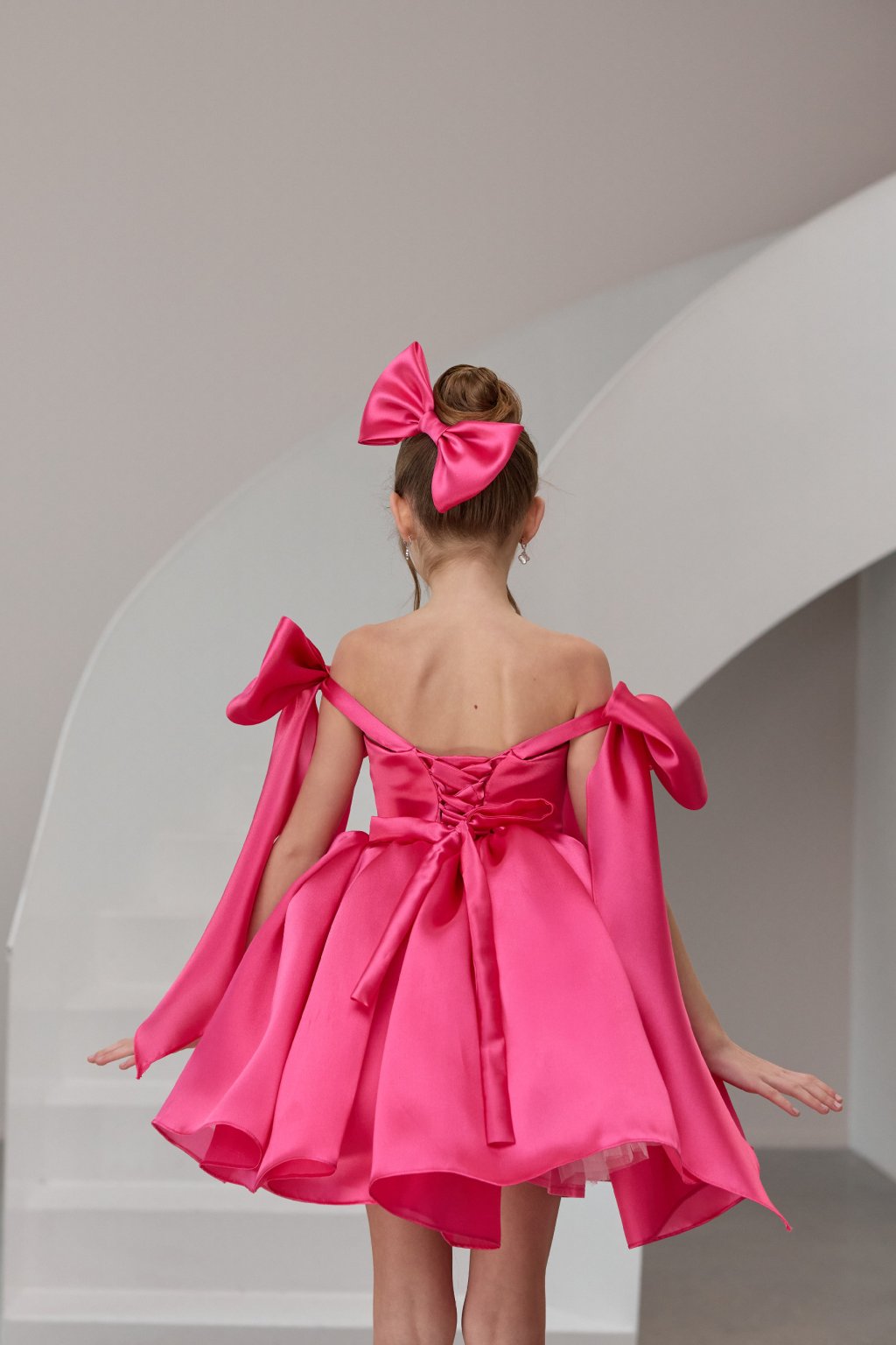 Dominantným prvkom sú výrazné mašle na ramenách s dlhými splývavými stuhami, ktoré dodávajú modelu jedinečný a neprehliadnuteľný vzhľad. Zadná časť je doplnená šnurovaním, vďaka ktorému sa šaty krásne prispôsobia postave a zároveň vytvárajú romantický detail.