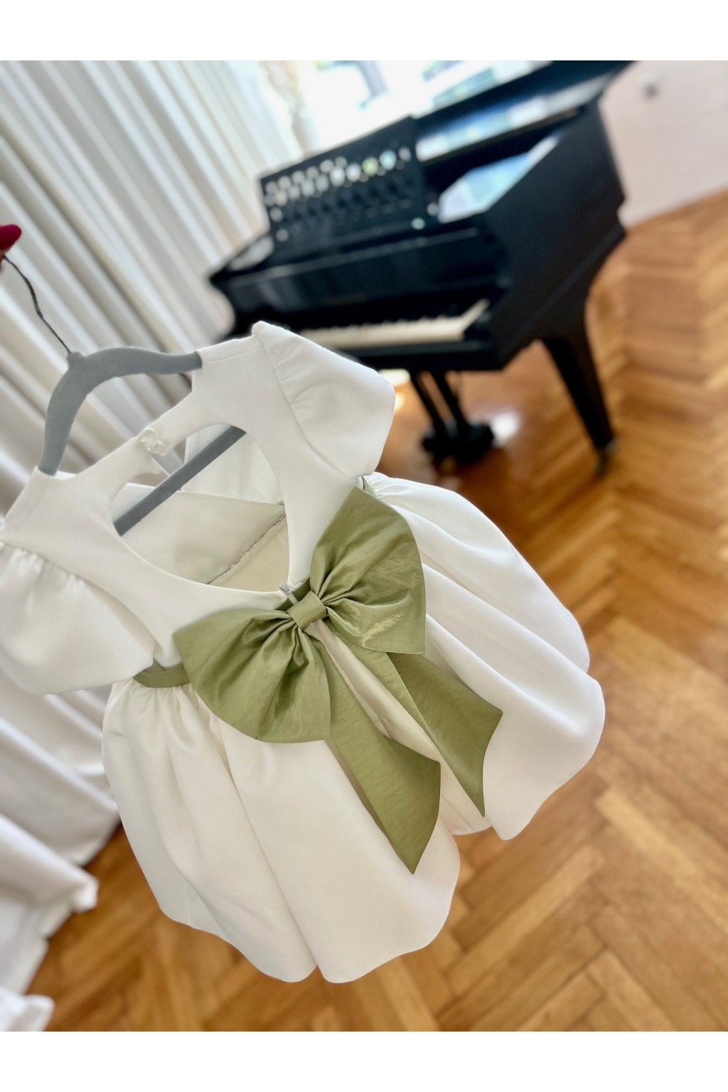 Krátke rukávy a rozšírená sukňa zaisťujú pohodlie a slobodu pohybu, zatiaľ čo veľká mašľa na chrbte dodáva eleganciu a štýl.