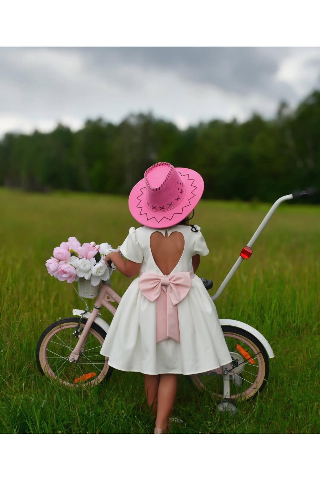 krátke rukávy, rozšírená sukňa, veľká mašľa vzadu, otvor v tvare srdca vzadu