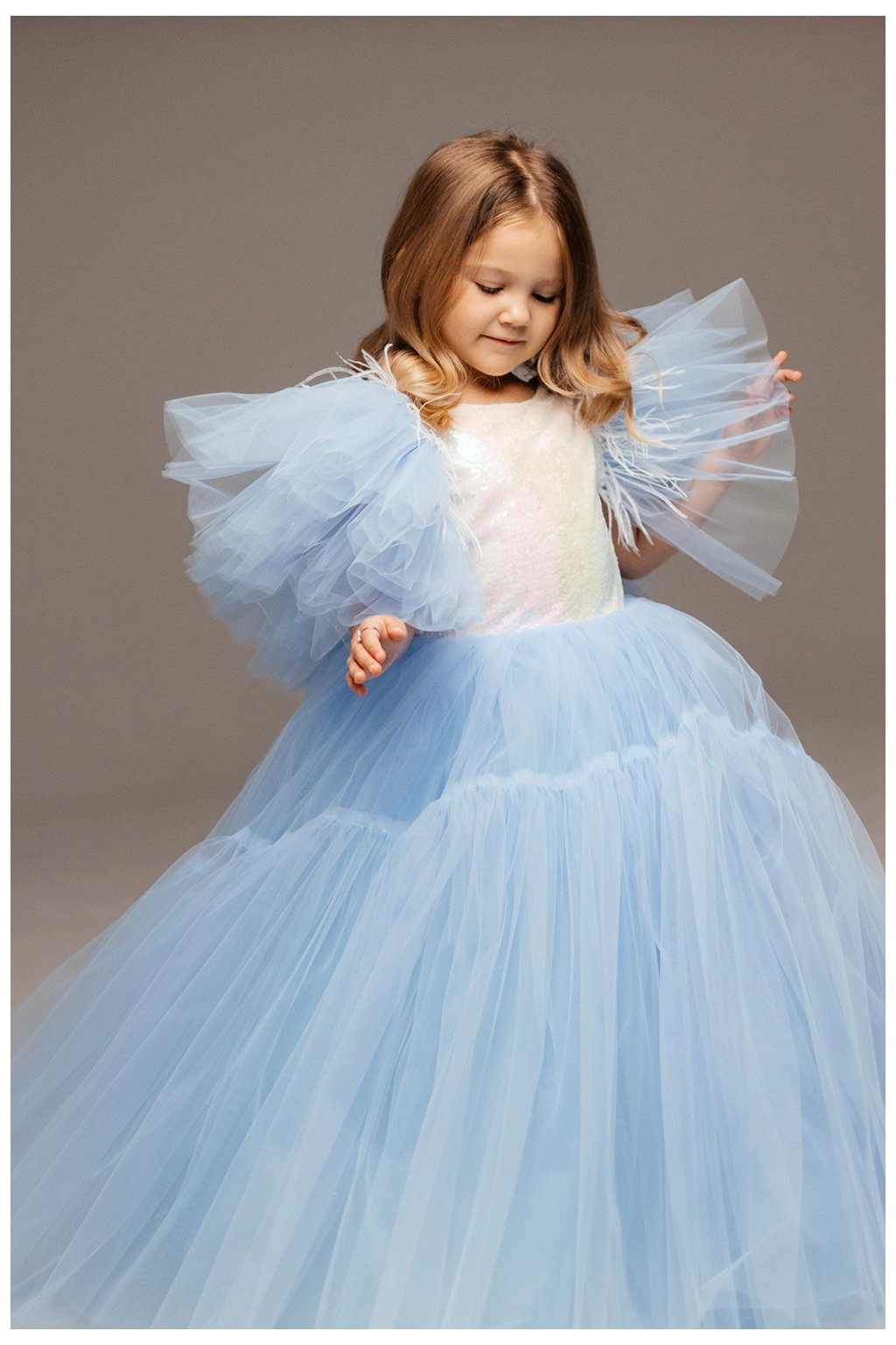 Nádherné dievčenské spoločenské šaty v jemnom modrom odtieni sú ako z rozprávky. Bohatá viacvrstvová tylová sukňa vytvára veľkolepý princeznovský objem a pri pohybe pôsobí ľahko, vzdušne a elegantne.