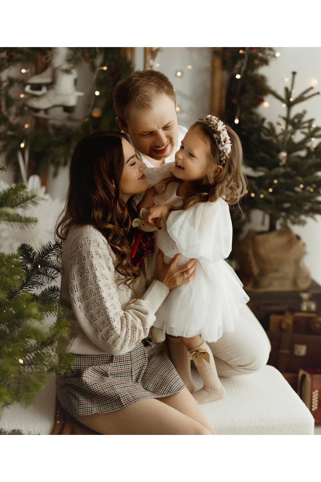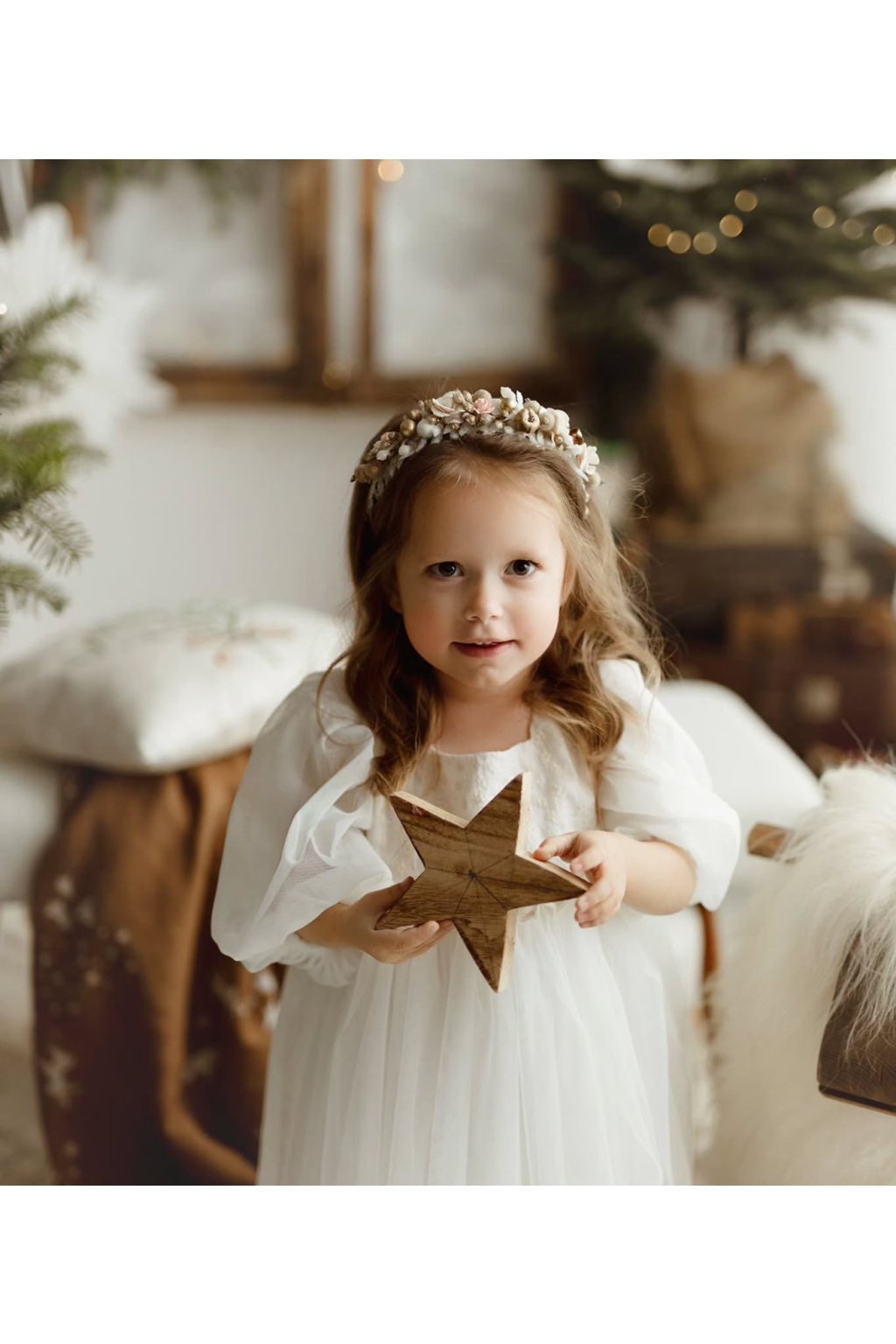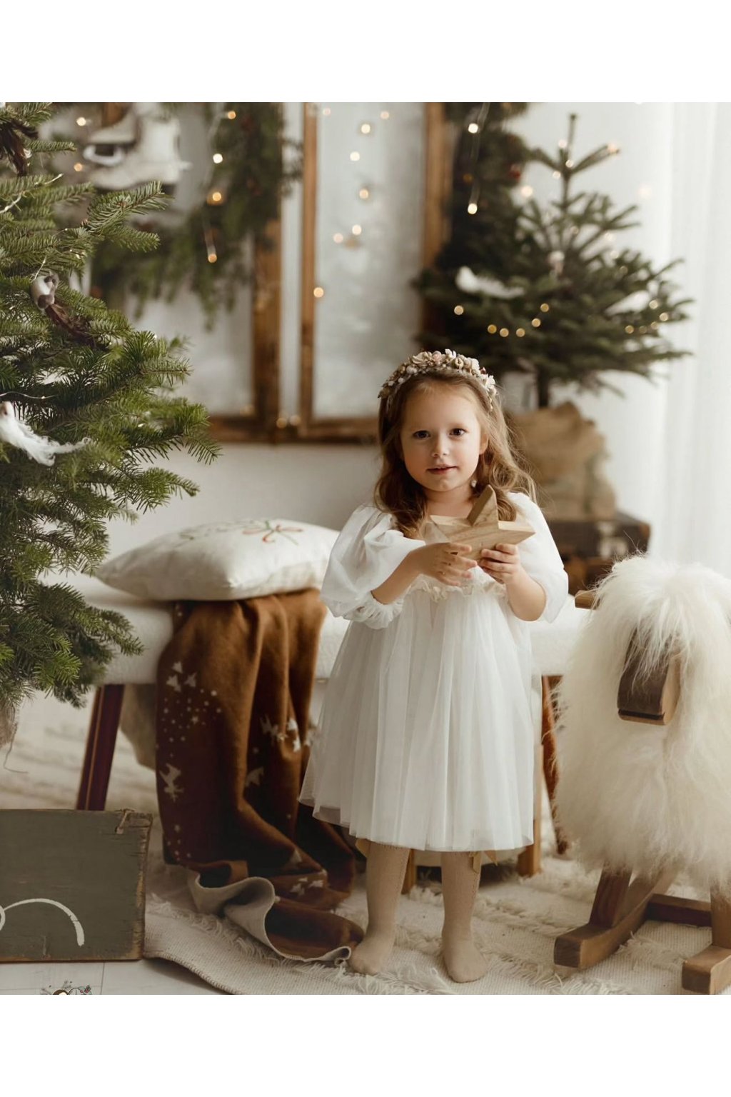 Výstrih vzadu je zaviazaný ozdobnými tylovými lemami. Zvonový rukáv je to, čo robí naše šaty výnimočnými - sú vyrobené z dvojitého tylu, ktorý sa dá nechať v 3/4 dĺžke alebo sa dá vyhrnúť po lakeť, čím sa vytvorí pútavý zvonový rukáv. Sukňa je vyrobená z bavlnenej podšívky a mnohých vrstiev tylu, takže šaty sú veľmi efektné a zároveň veľmi ľahké a pohodlné pre najmenších.