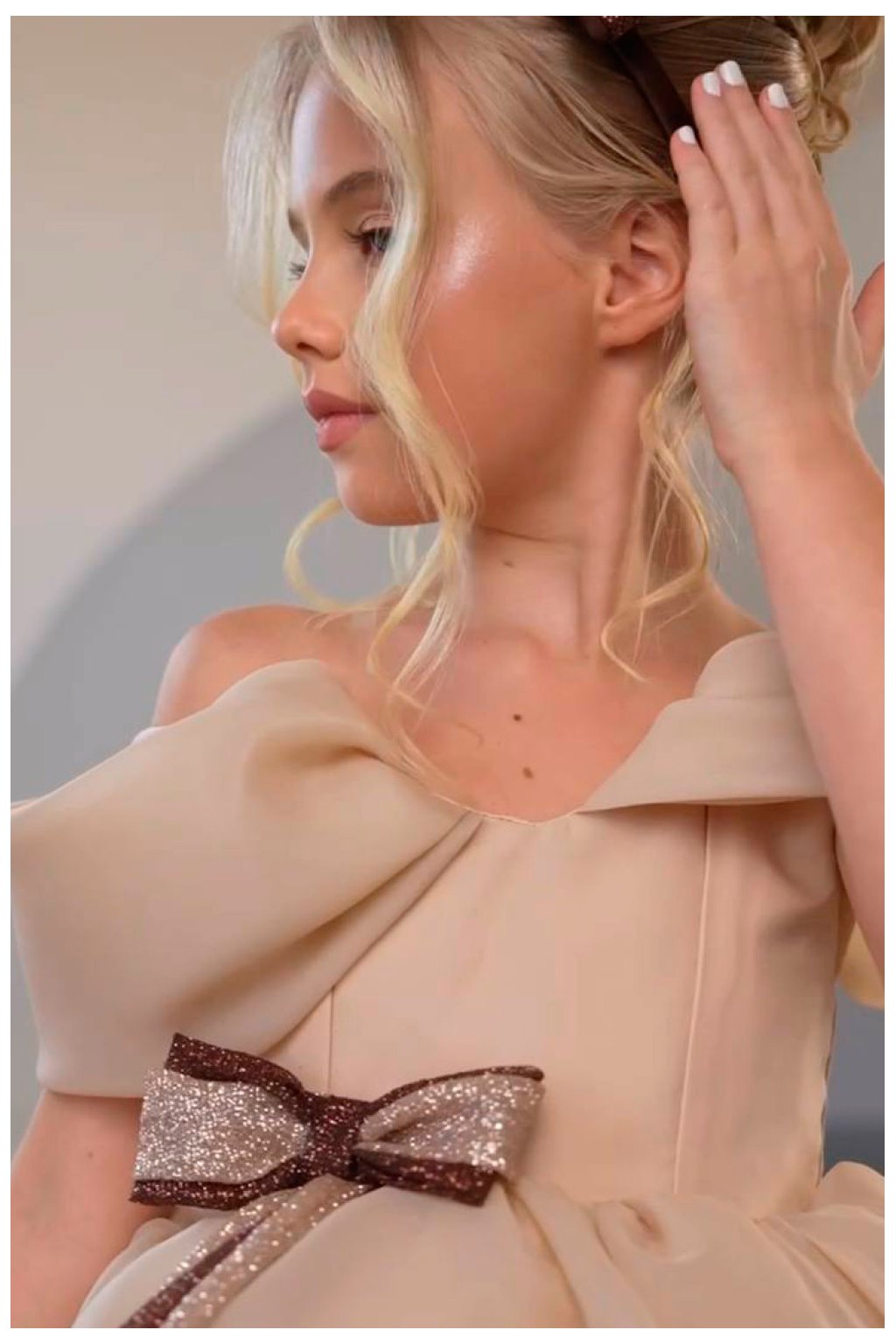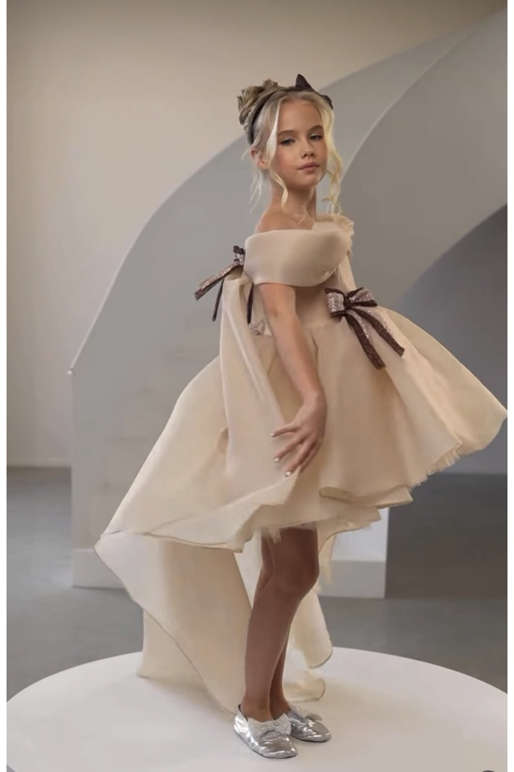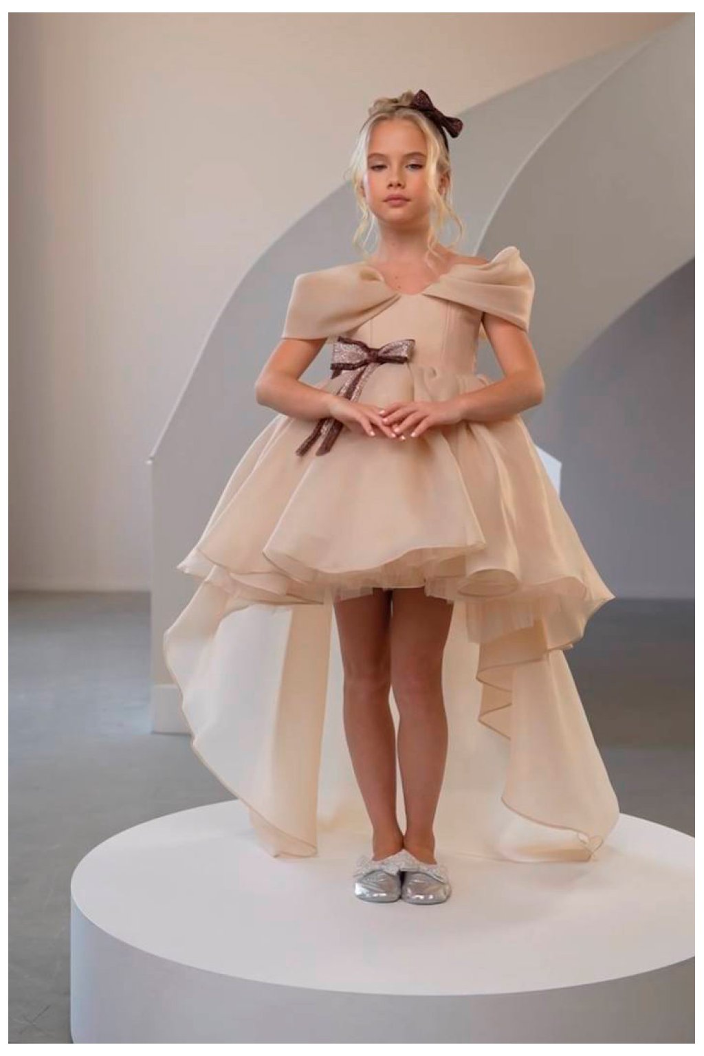 Detské spoločenské šaty s romantickým tylovým efektom Elegantné detské šaty v jemnom krémovom odtieni sú ideálnou voľbou na svadby, oslavy, fotenie či iné výnimočné príležitosti. Bohato vrstvená sukňa z ľahkého tylu vytvára nádherný nadýchaný objem a pri pohybe pôsobí vzdušne a slávnostne. Asymetrický predĺžený zadný diel dodáva modelu luxusný vzhľad a jedinečný štýl.