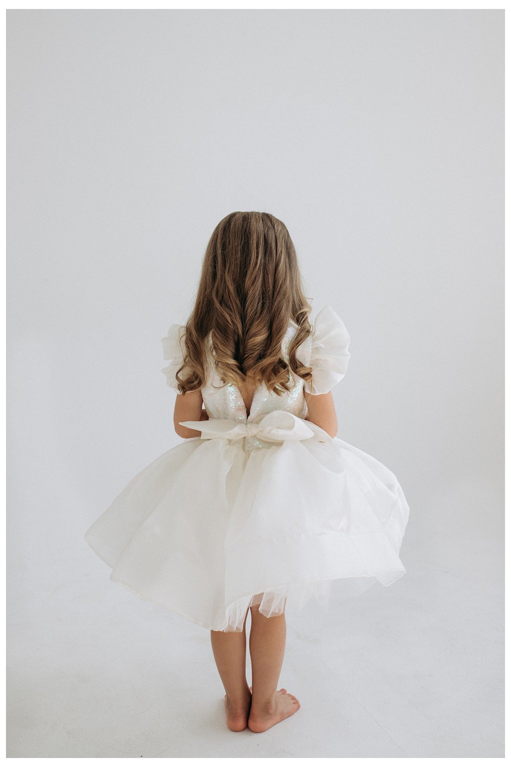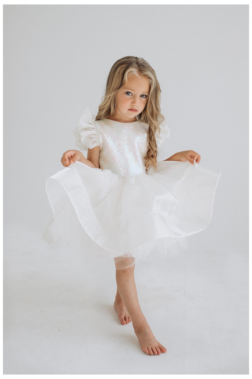 Vrchná časť je zdobená jemnými flitrami, ktoré pri pohybe vytvárajú decentný lesk a dodávajú modelu slávnostný charakter. Rukávy sú doplnené ľahkými tylovými volánmi, ktoré pôsobia vzdušne a romanticky.