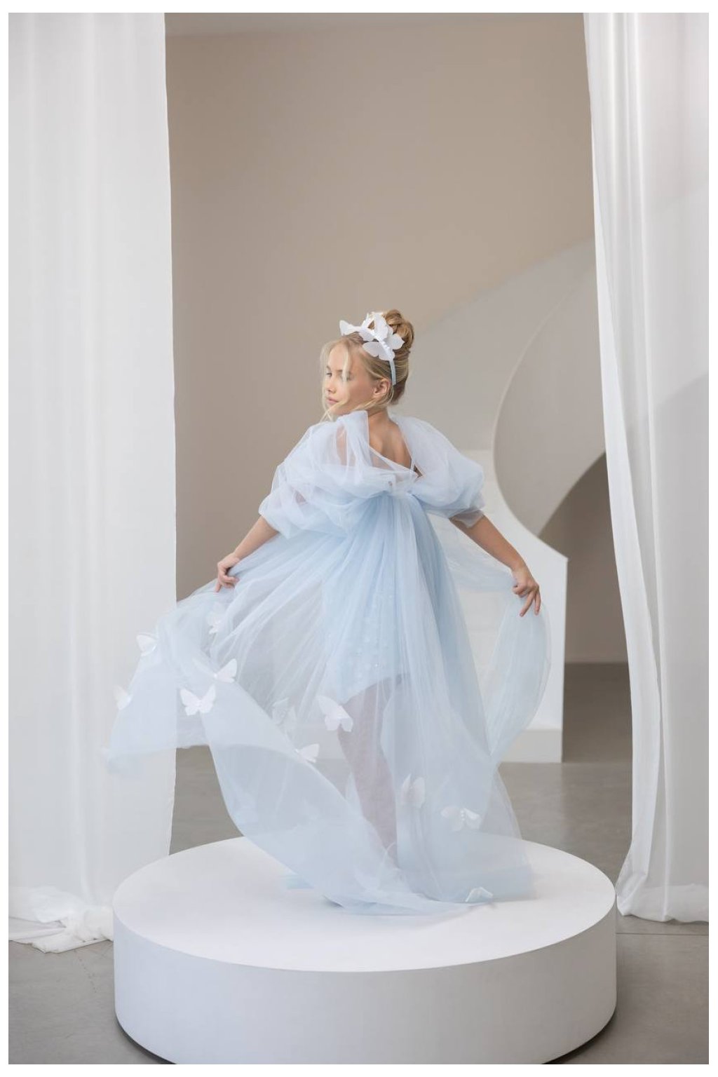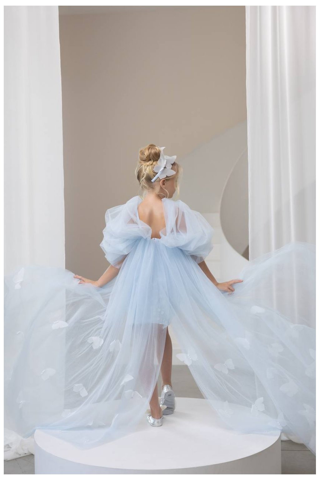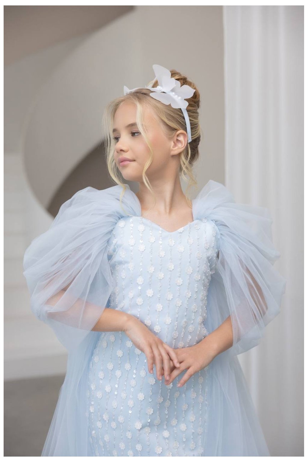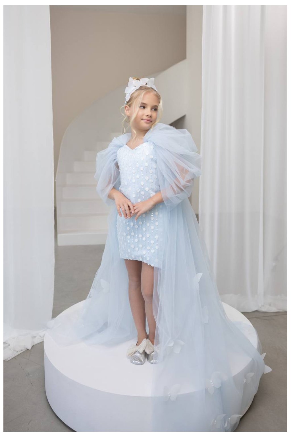 Tieto nádherné dievčenské šaty v nežnej svetlomodrej farbe pôsobia ako z rozprávky. Kratší, bohato zdobený podkladový model s jemnou aplikáciou vytvára luxusný základ, ktorý je doplnený dramatickým tylovým plášťom s dlhou vlečkou. Výsledkom je jedinečný efekt, ktorý zaujme na prvý pohľad.