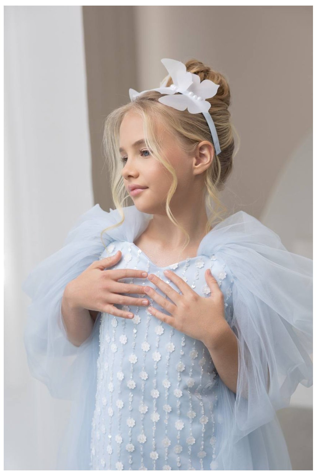 Vzdušné tylové rukávy dodávajú šatám objem a noblesu, zatiaľ čo splývavá vlečka s jemnými detailmi pôsobí étericky a slávnostne. Model je ideálny pre malé slečny, ktoré chcú zažiariť a cítiť sa výnimočne.