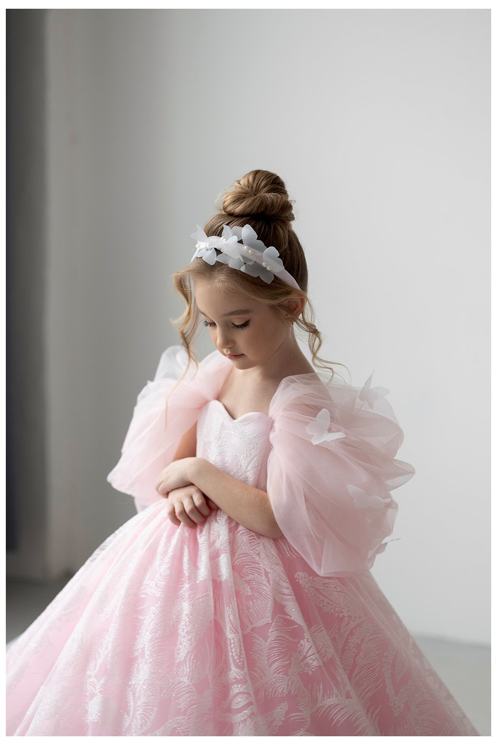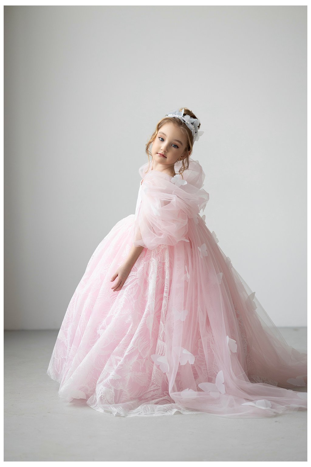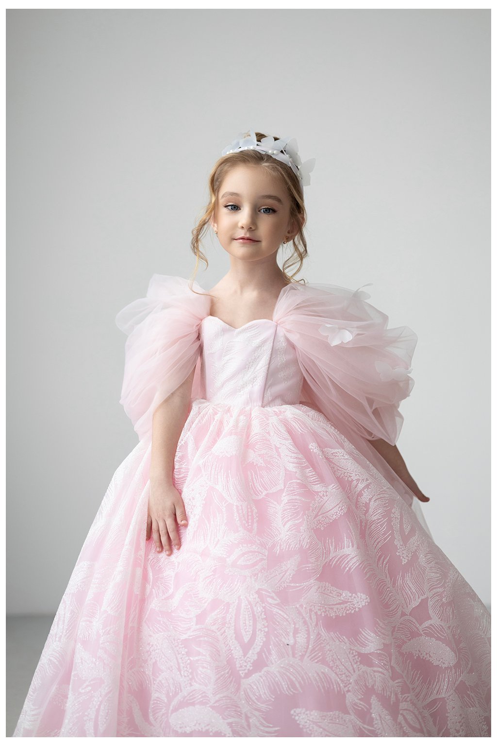 Tieto očarujúce detské šaty v nežnom ružovom odtieni sú ako stvorené pre malé princezné na výnimočné chvíle. Bohato riasená sukňa s jemným vzorom dodáva šatám luxusný vzhľad, zatiaľ čo vzdušný tylový plášť s 3D motýlikmi vytvára magický, rozprávkový efekt pri každom pohybe.