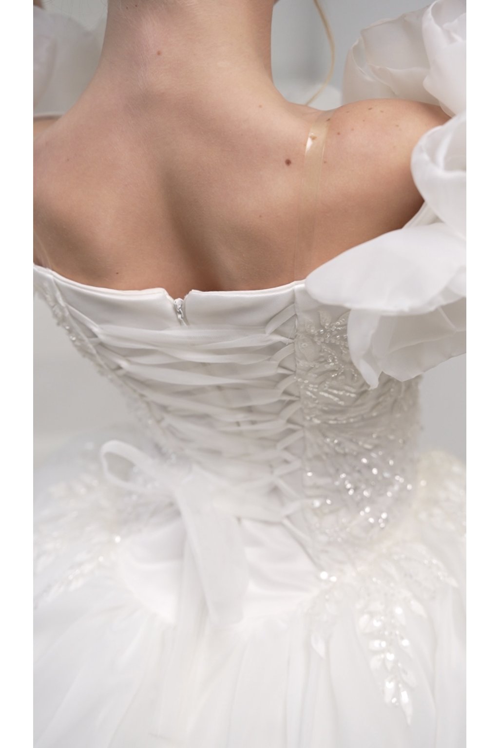 Veľkou výhodou modelu je odnímateľná vlečka, vďaka ktorej môžete šaty jednoducho prispôsobiť príležitosti — na ceremoniál s vlečkou pre maximálny efekt, na pohyb a zábavu bez nej pre väčšie pohodlie. Šaty tak ponúkajú praktickosť aj variabilitu v jednom.