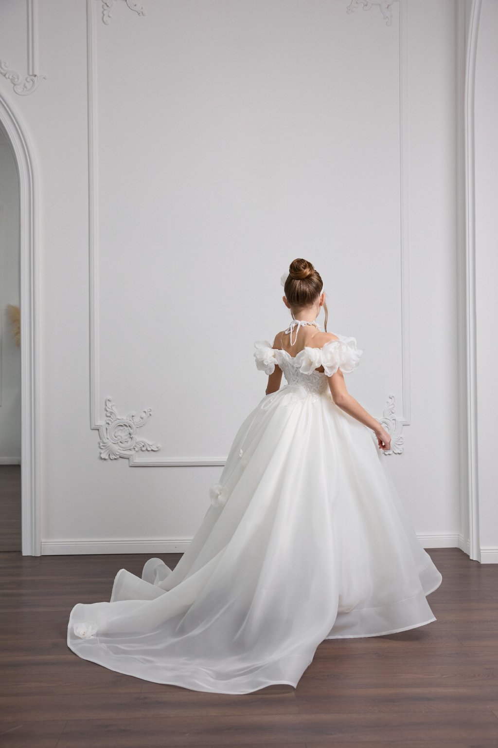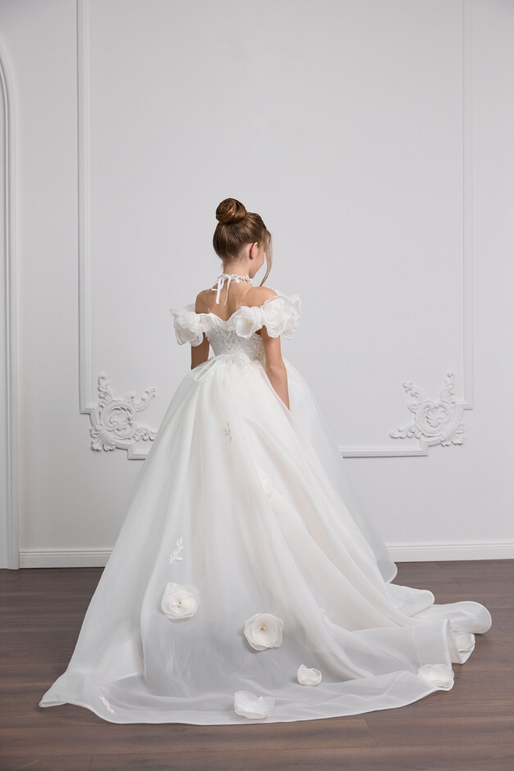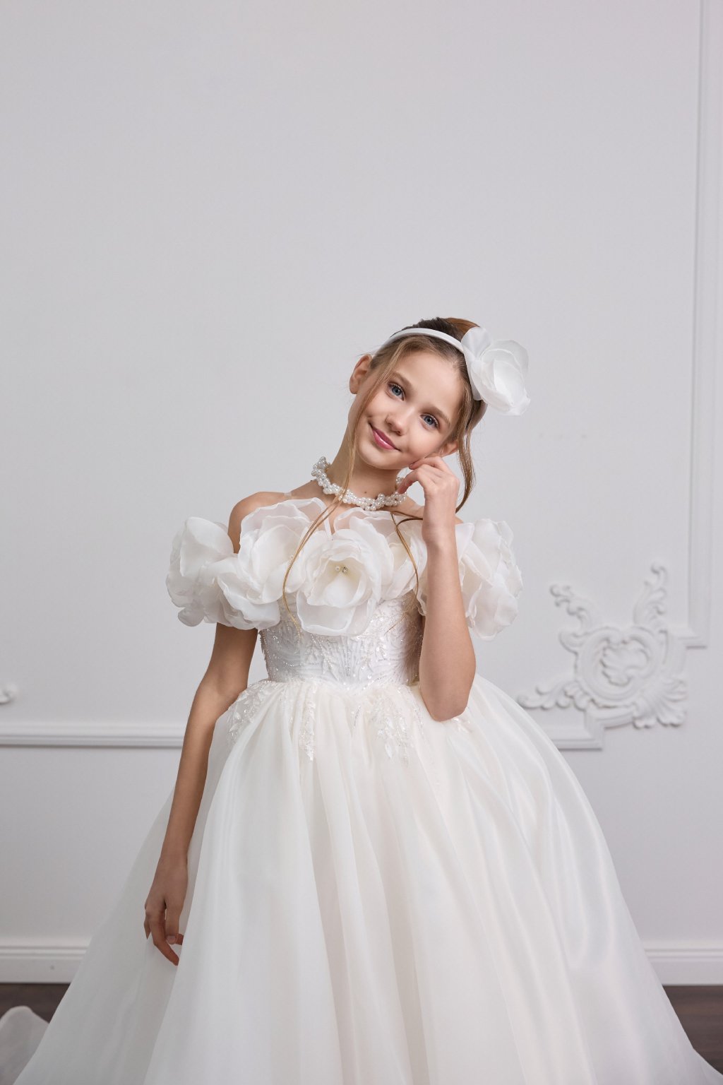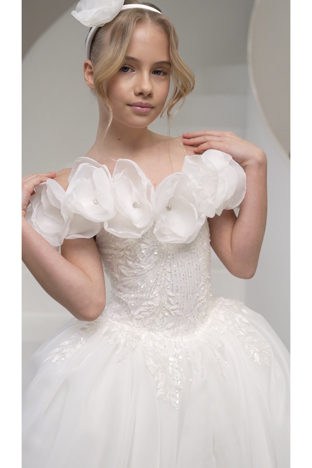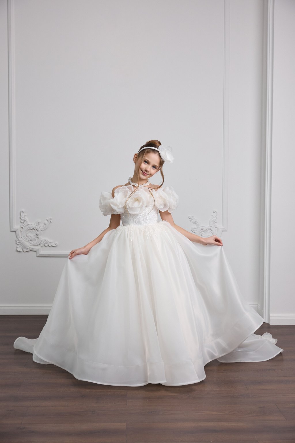 Tieto výnimočné detské šaty sú stelesnením jemnosti a noblesy. Bohatá nadýchaná sukňa v kombinácii s romantickým živôtikom zdobeným výraznými kvetinovými aplikáciami vytvára skutočne slávnostný vzhľad pre malé dámy.