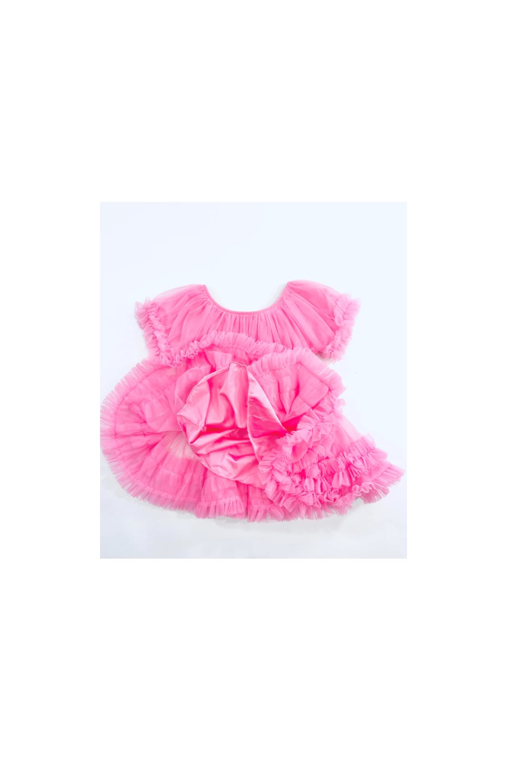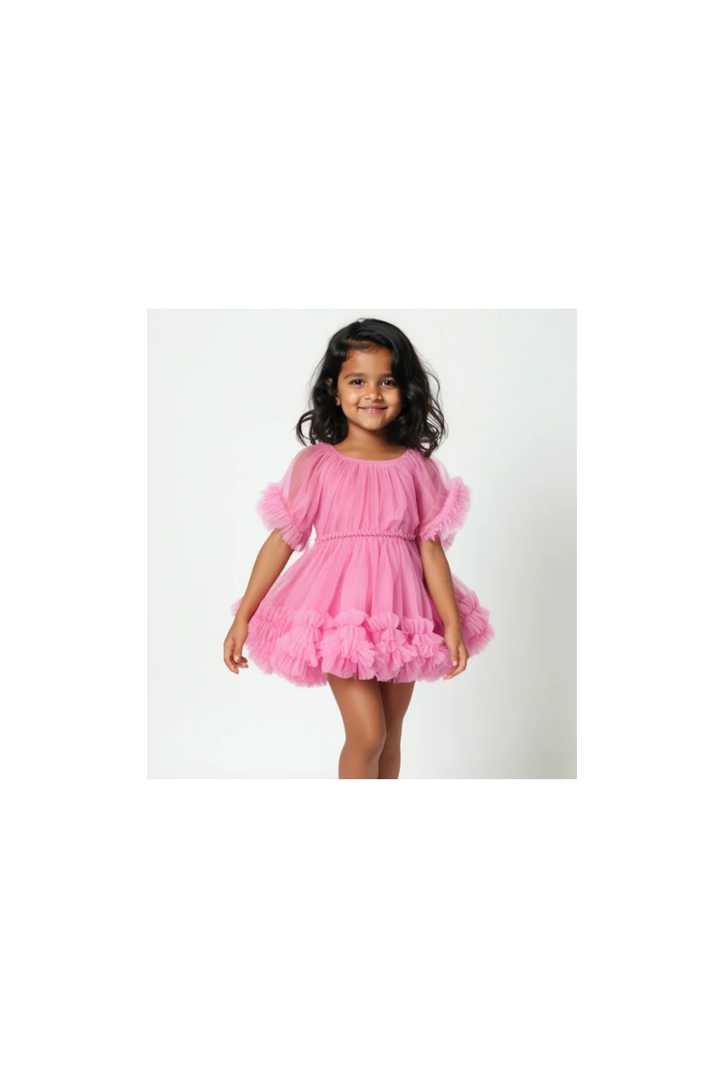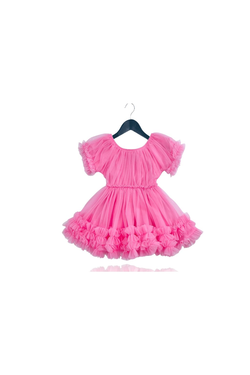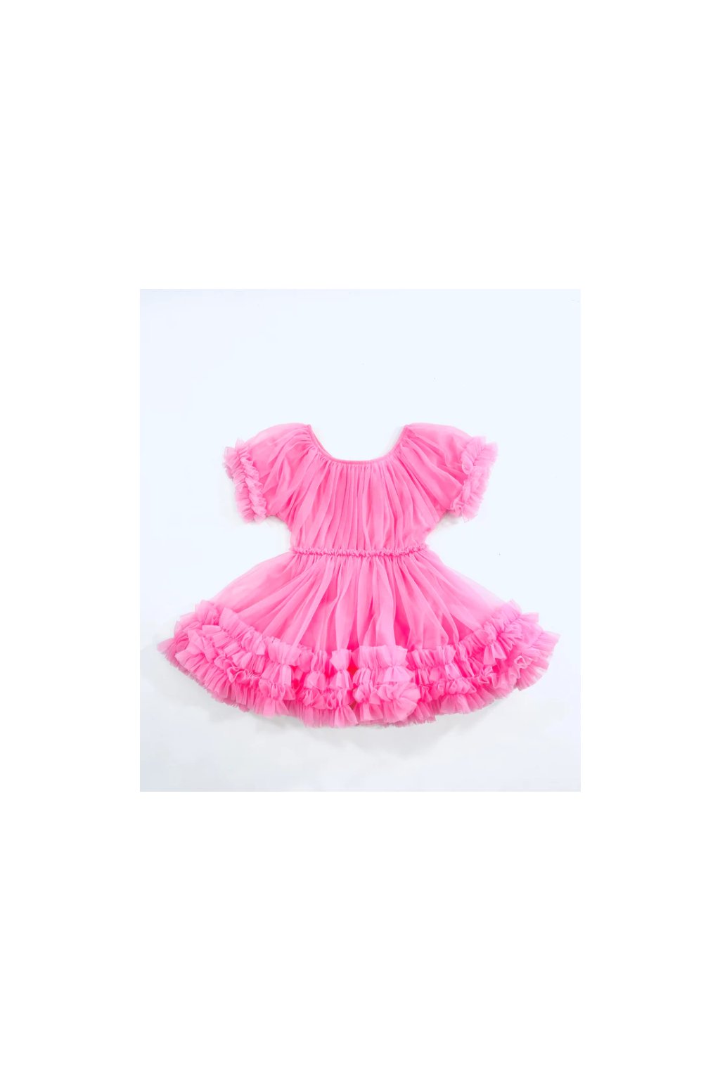 Slávne volánikové šaty sú vyrobené z charakteristického super mäkkého šifónu, ktorý je taký mäkký, že si ho musíte ohmatať, aby ste tomu uverili. Nafúknuté krátke rukávy, mnoho vrstiev a volánikov vytvára nadýchanú, plnú siluetu a je jednoducho úžasná.