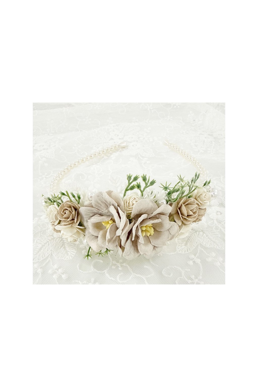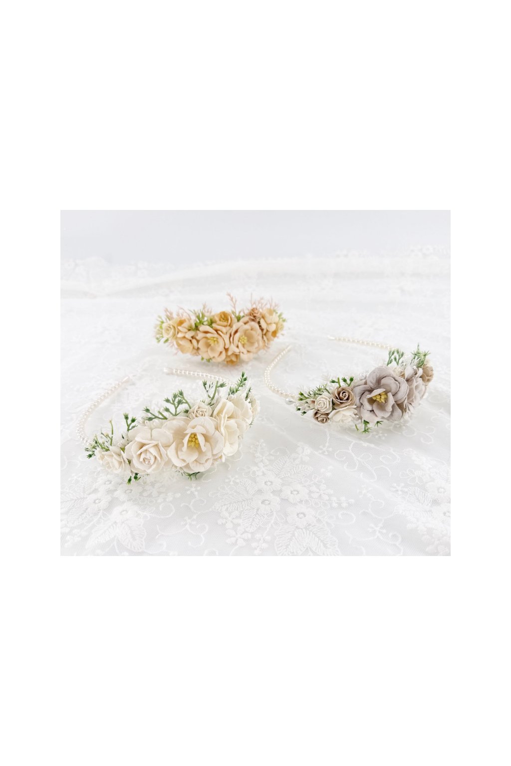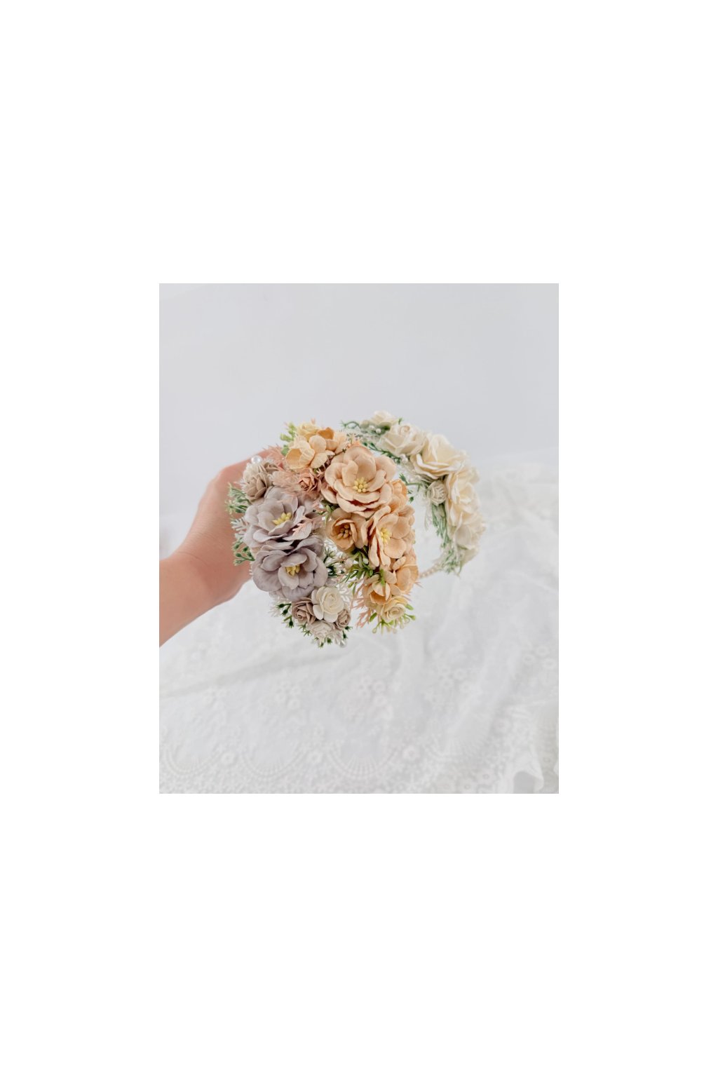 Táto kvetinová čelenka v tvare polprútika je ručne vyrobená z papierových kvetov morušovej farby v odtieňoch pieskovo béžovej s ozdobami. Kvetinová aplikácia má v najširšom bode rozmery 20 cm x 8 cm a je pripevnená ku krásnej, pohodlnej perlovej čelenke. Je veľmi ľahká a jemná a netlačí na hlavičku. Vďaka svojej veľkosti je vhodná pre deti od 6 rokov.