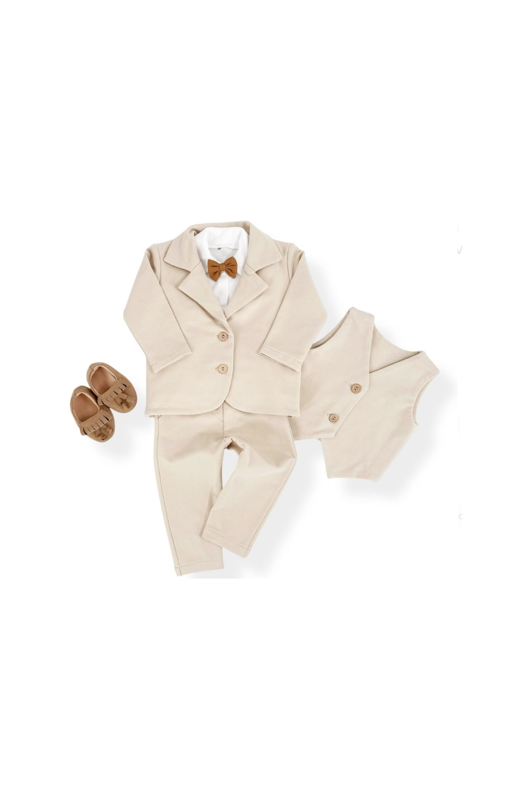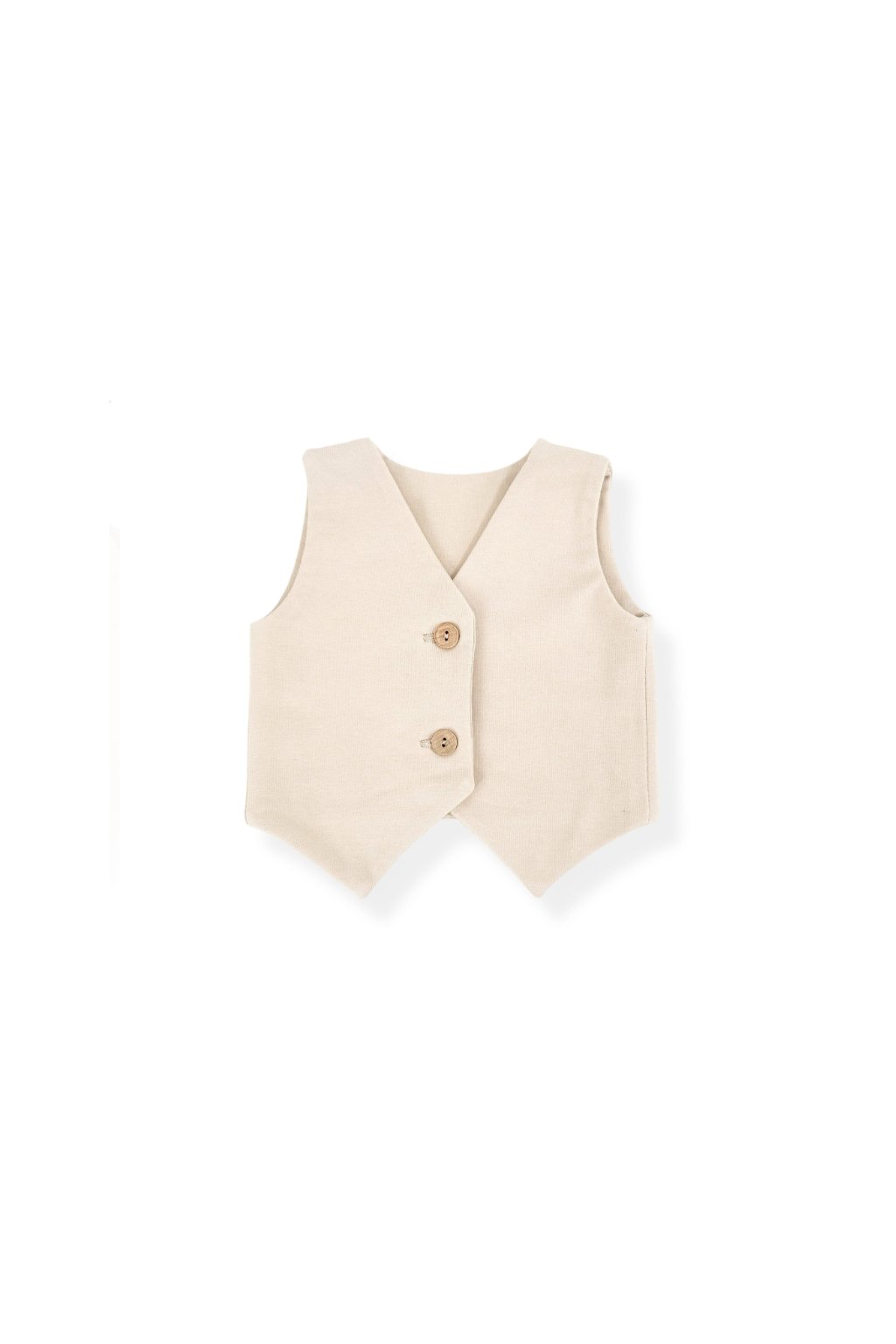 Chlapčenská vesta z mäkkej, elastickej a pohodlnej prémiovej bavlnenej pleteniny v pieskovo béžovej farbe s drevenými gombíkmi.