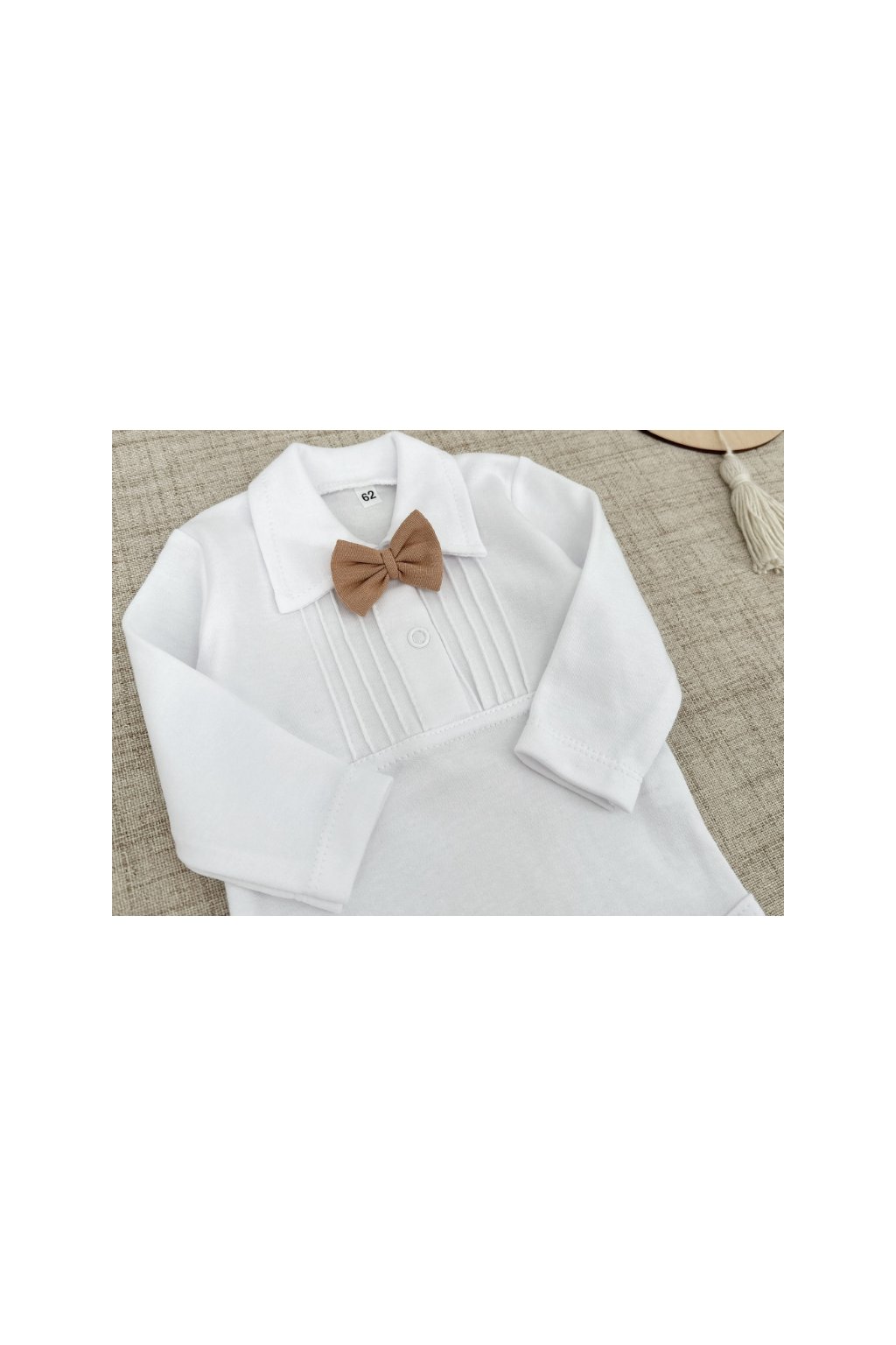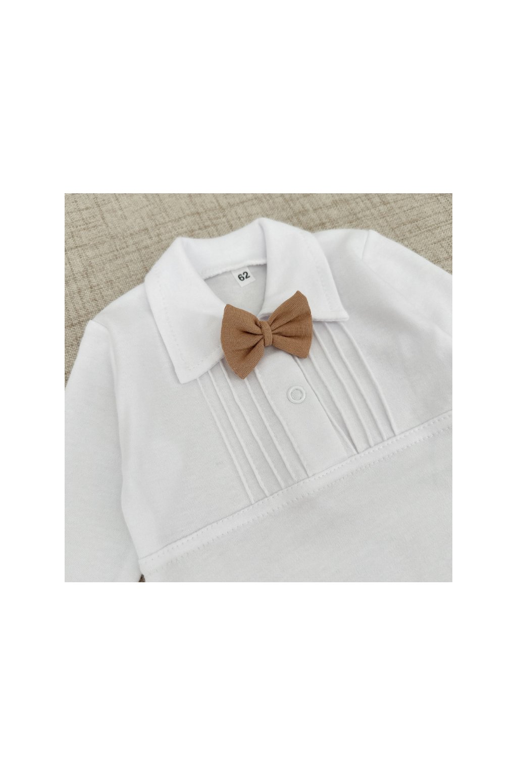 Motýlik z bavlneného úpletu na jemnej, vysoko elastickej okrúhlej gumičke, prispôsobenej veľkosti goliera, v svetlej karamelovej farbe.