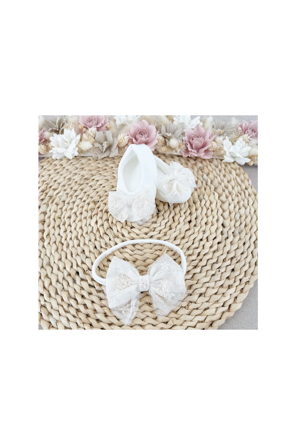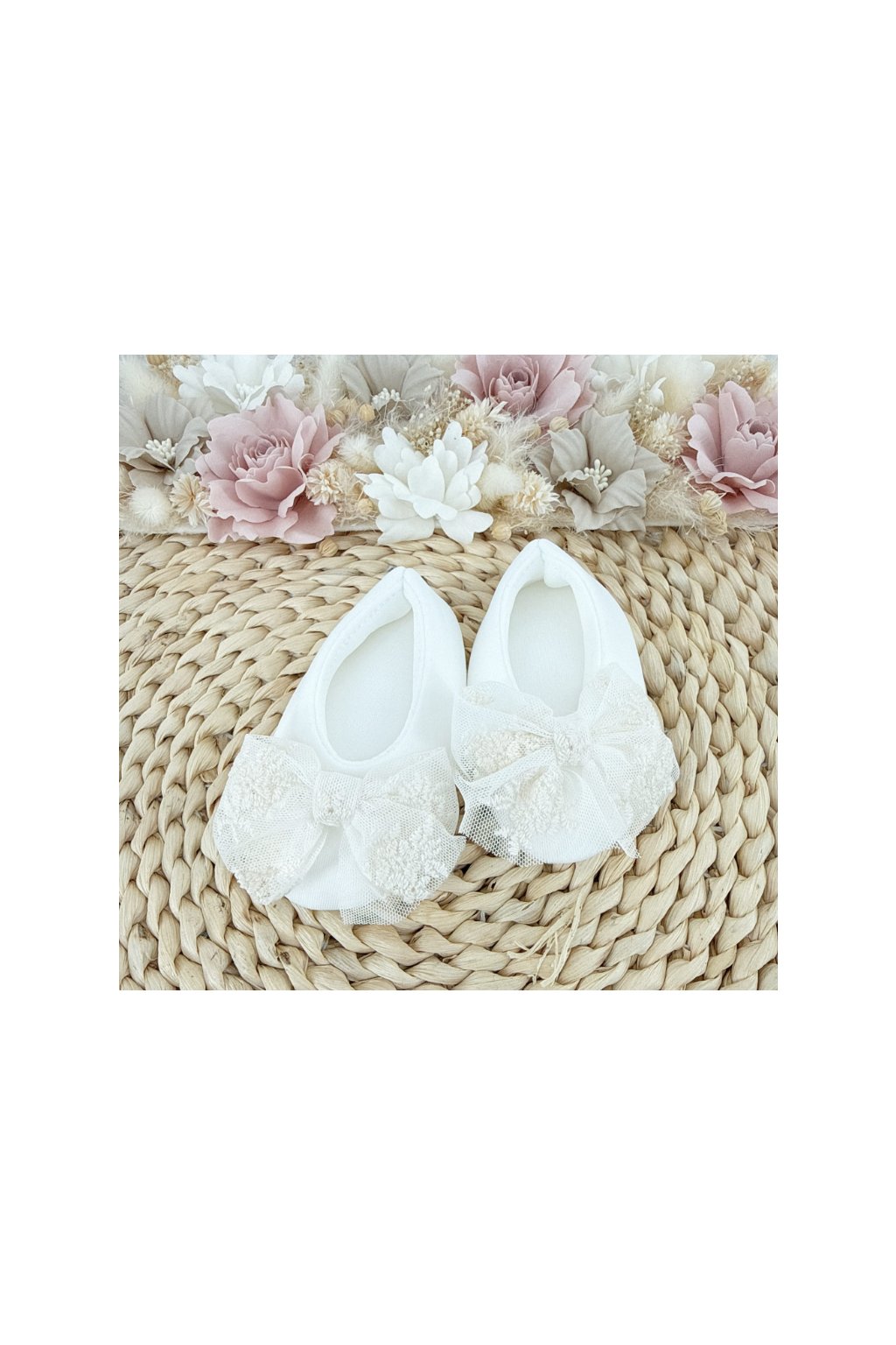Topánky na krst, detské topánočky, balerínky pre dievčatá, vyrobené z ecru peny potiahnutej bavlnou, ozdobené béžovou čipkovanou mašľou, rovnakou ako na šatách Anastazja 5. Topánky sú mäkké a mierne elastické, veľkosť sa odvíja od dĺžky chodidla.