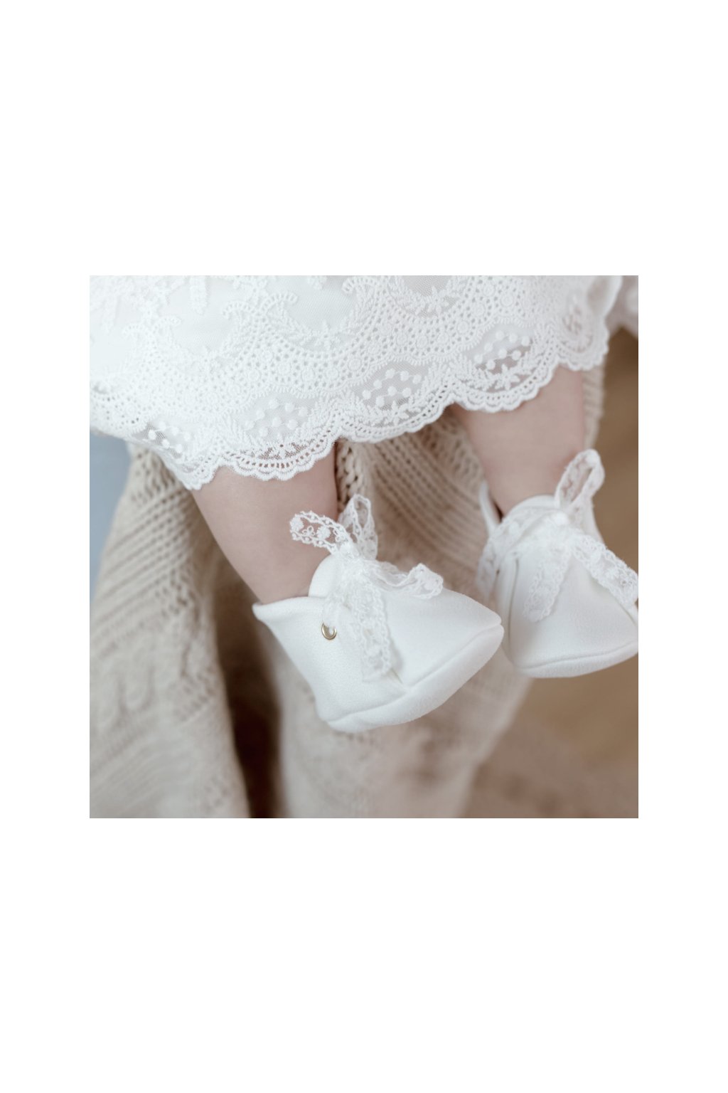 Tieto dievčenské krstné topánočky sú vyrobené z peny potiahnutej mäkkou ecru semišovou látkou a ozdobené čipkovanou mašľou. Topánočky sú mäkké a mierne elastické a veľkosť sa odvíja od dĺžky chodidla.